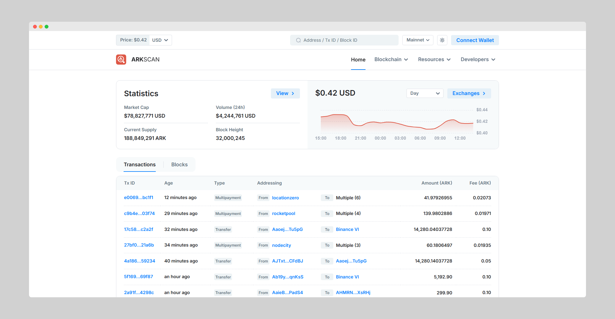 ARK官方区块浏览器,提供USDPrice数据,区块信息,区块高度,时间戳,手续费等信息