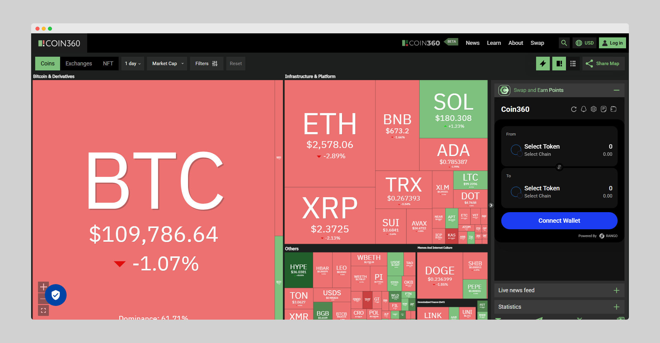 Coin360是一个交互式信息图表,显示加密货币资本化和利率,市场状态,ICO和加密映射
