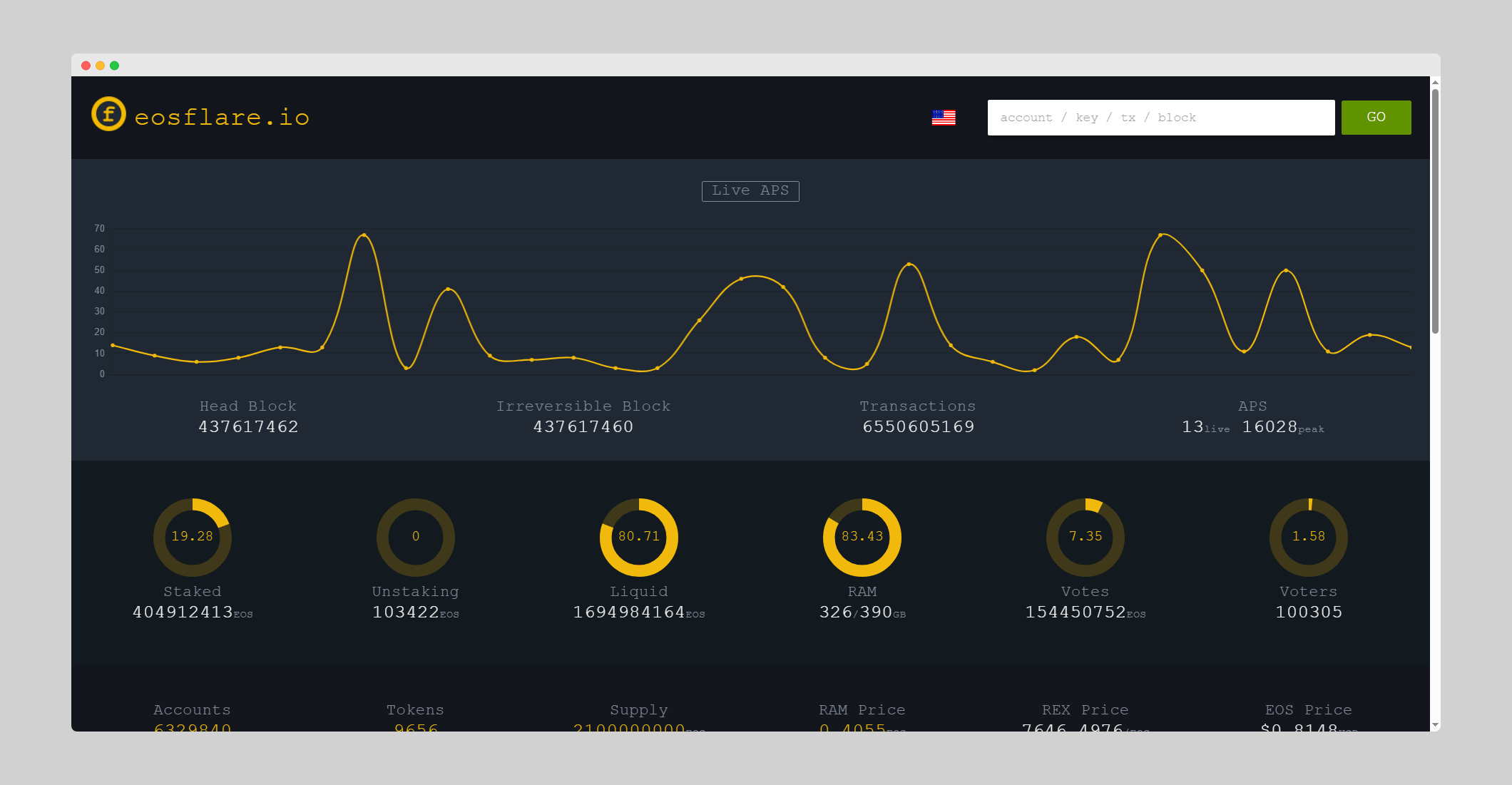 一款暗色风格的EOS浏览器,用曲线展示了TPS实时数据,用环形图展示了RAM、质押、赎回、可用余额等数据