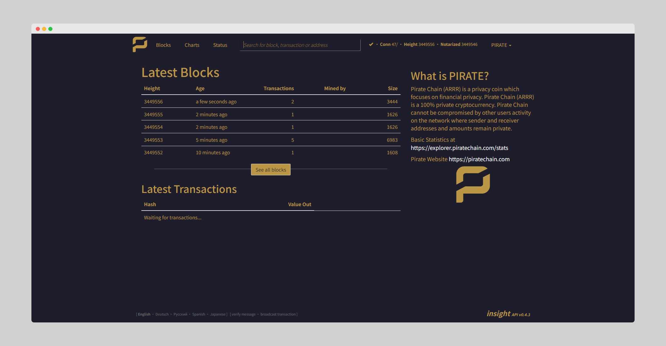 Pirate是海盗链Pirate Chain(ARRR)的官方浏览器,提供区块查询,交易查询,货币购买等功能