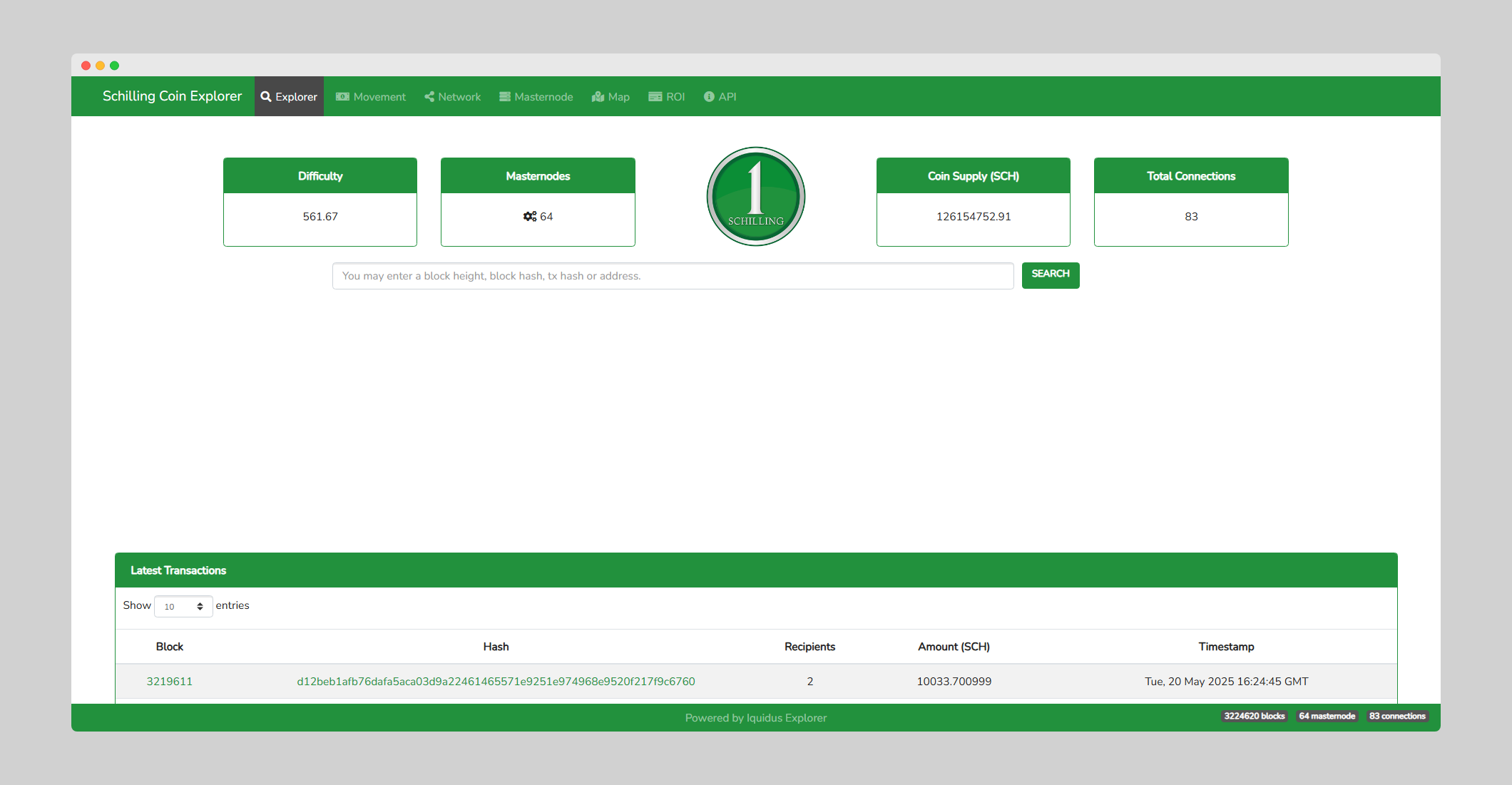 Schilling Coin Explorer是Schilling Coin (SCH)的官方浏览器,提供区块查询,地址查询,交易查询等功能