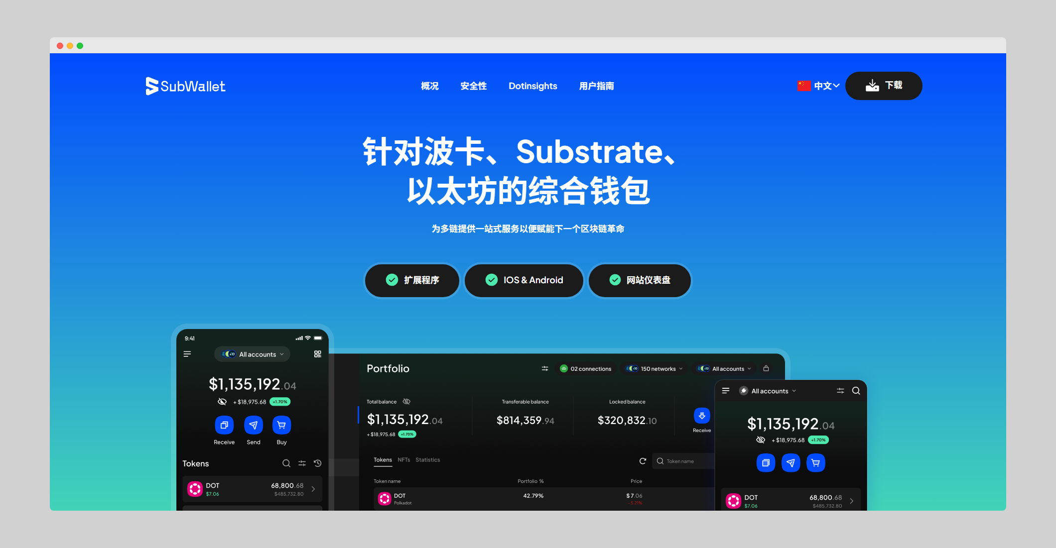 SubWallet 是波卡和 Kusama 生态的非托管 Web3 扩展钱包,特点是用户友好且易于使用。由于资产管理是 SubWallet 最常用的功能之一,团队投入了大量精力来简化流程。支持 380 多种代币,包括 USDT、USDC 等稳定币,用户可轻松进行单链和跨链转账,而无需了解 XCM 等复杂的概念。在产品的日常体验上,SubWallet 根据具体的使用体验场景进行了一系列细致的优化设计